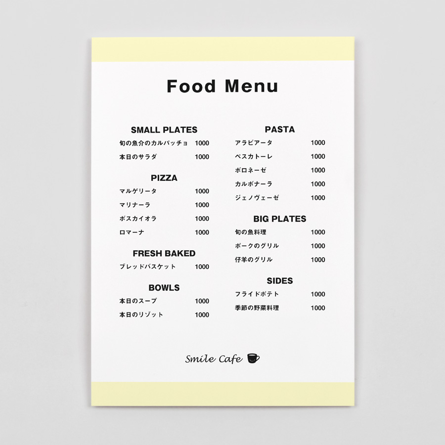 | アイテム情報 | A4サイズ(297x210mm) のメニューテンプレートです。 お店のイメージに合ったデザインをご選択いただき、レイアウトに商品名や価格などの 必要事項をご入力いただくと、簡単にメニューが作成できます。 こちらはattaにデータ作成をおまかせいただく商品です。 「名入れあり」ボタンをご選択いただくと、制作代が適用されます。 ご注文の流れ ①ページ数ををお選びいただきます。②メニューのセット数(枚数)をお選びいただきます。 ※ページ数が2ページの場合、2セットをお選びいただくと、2ページを2枚づつ印刷いたします。 ③「データ制作あり」ボタンを選択しカートへ入れて購入にお進みください。 ④注文完了後にメニュー内容をフォームへご記入ください。 ⑤attaでレイアウトを作成し、メールで校正(仕上がりイメージ)をお送りいたします。 ⑥お客様のご確認後、印刷をして納品いたします。 ヘルプ