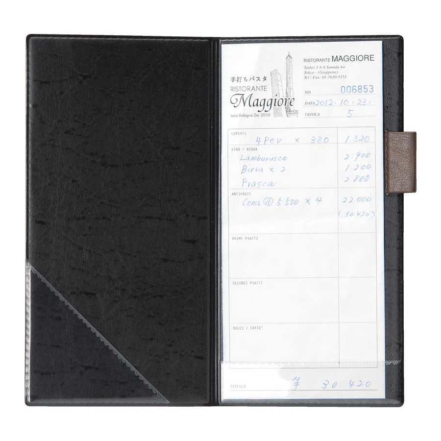 | 商品規格 | [サイズ] W128xH250mm 利用最大伝票サイズ 約W110xH240mm [色] ブラック・ブラウン・エンジ・アイボリー・グリーン・ブルー [素材] レザータッチ ※ペン差し付き ※両サイドポケット付 |