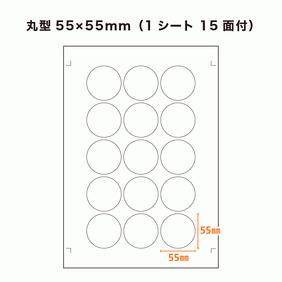 | 商品規格 | ラベルサイズ: 30×30mm (1シート 48面付) 35×35mm (1シート 35面付) 40×40mm (1シート 30面付) 45×45mm (1シート 24面付) 50×50mm (1シート 20面付) 55×55mm (1シート 15面付) 用紙:アート紙 カラー:フルカラー片面印刷 |
