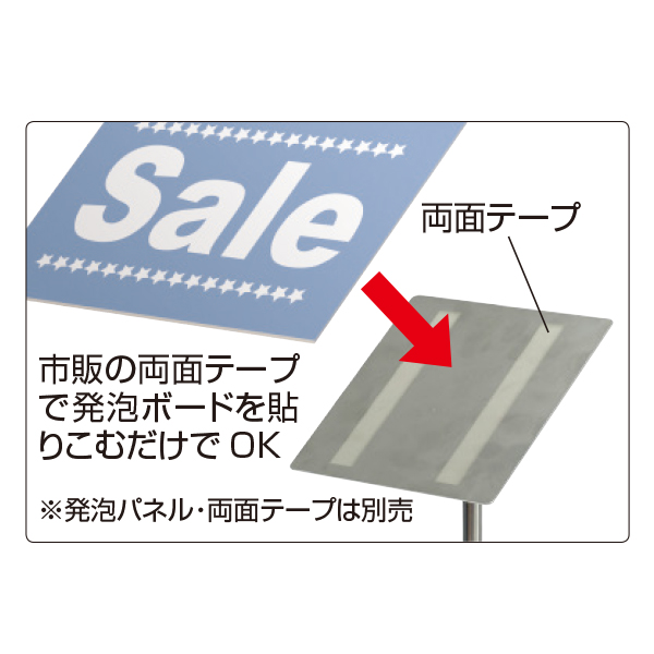 | アイテム情報 | 店舗、店頭、各売り場などでの販促の必需品。 効果的なディスプレイや宣伝広告が可能です。 発泡ボードを両面テープで貼り付けるだけ。 手軽にサインスタンドとしてご利用いただけます。 (※発泡ボード・両面テープは付属しておりません。) |
