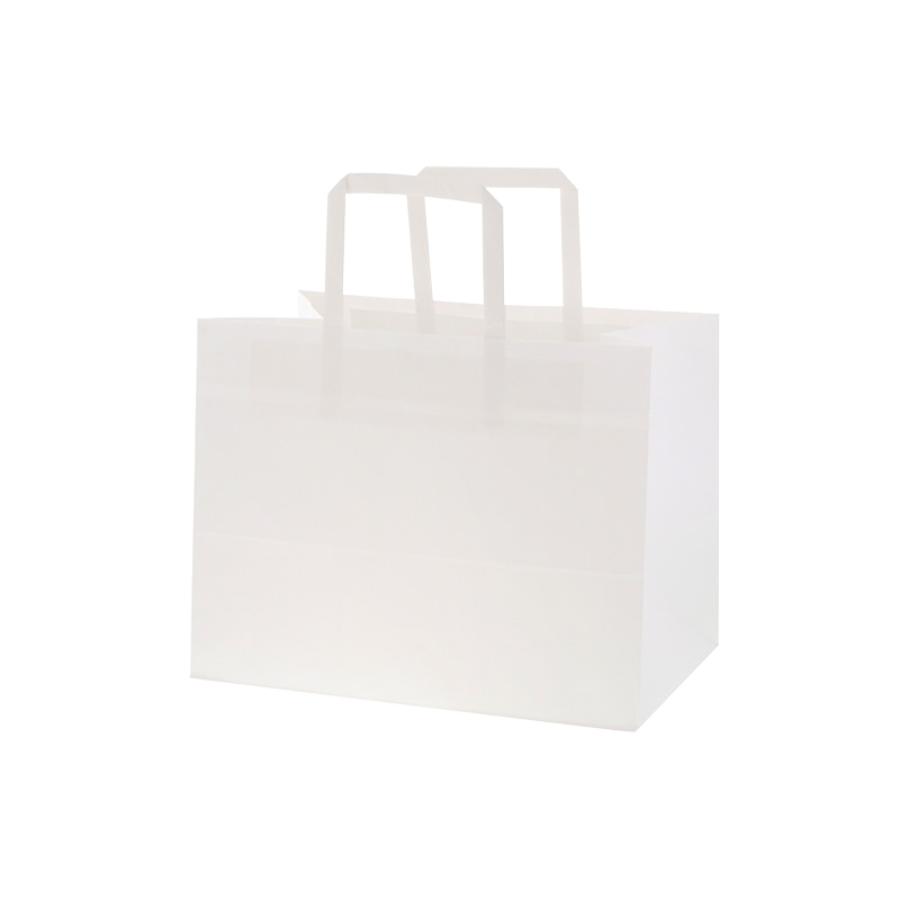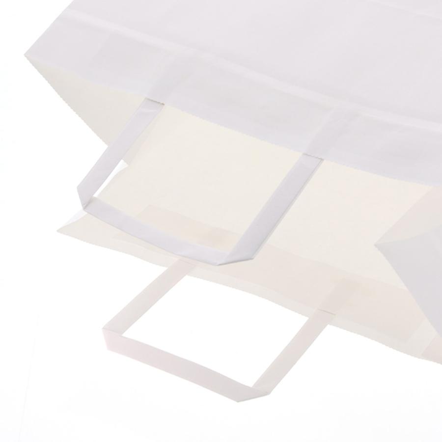 | アイテム情報 | ハンドルは一般的な平紐の幅10mm幅よりも太めの12mm幅を採用しているので、手にやさしく持ちやすい紙袋です。オーソドックスな白無地なので、催事など色々な用途でご使用頂けます。 |