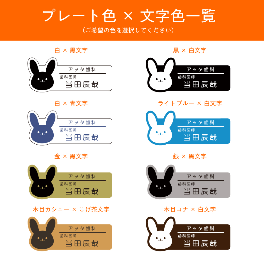 金+黒文字 / 銀+黒文字 / 白+黒文字 / 白+青文字 / 黒+白文字 / ライトブルー+白文字 / 木目カシュー +こげ茶文字 / 木目コナ+白文字