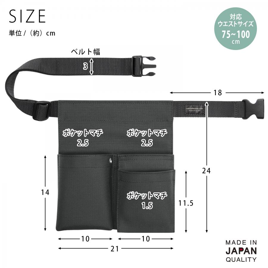 | 商品規格 | [サイズ] W21xH24(ポケット丈14)xポケットマチ2.5cm [適合ウエストサイズ] 75~100cm [色] ブラック [素材] ナイロン(裏PVCコーティング)・ポリプロピレン 合成樹脂・アルミ ※可動式ポケット付 |