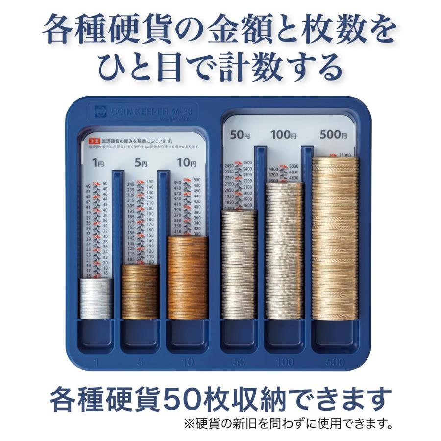 | アイテム情報 | 釣銭の整理に最適なコインキーパー。1円~500円の硬貨が各50枚ずつ収納できます。ひと目で分かる金額表示と、両替にも便利な段差付きです。 |