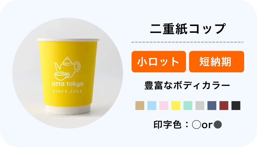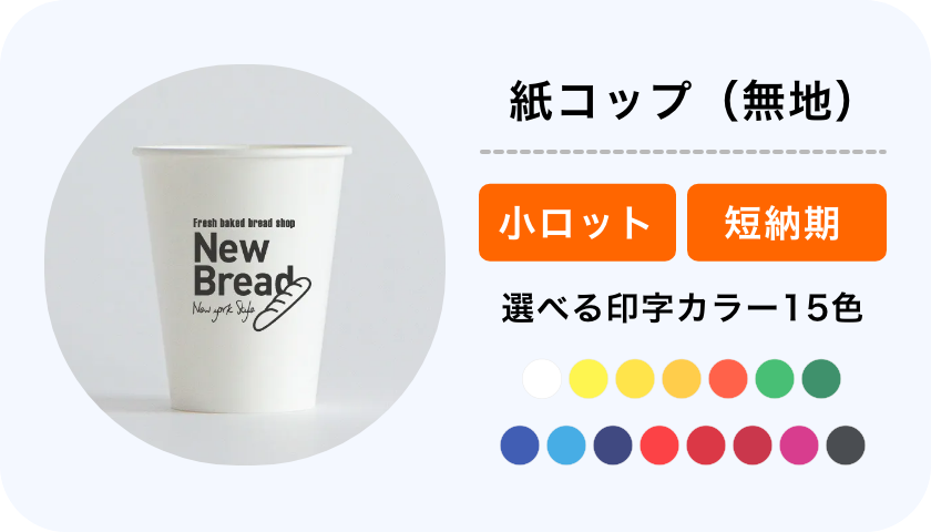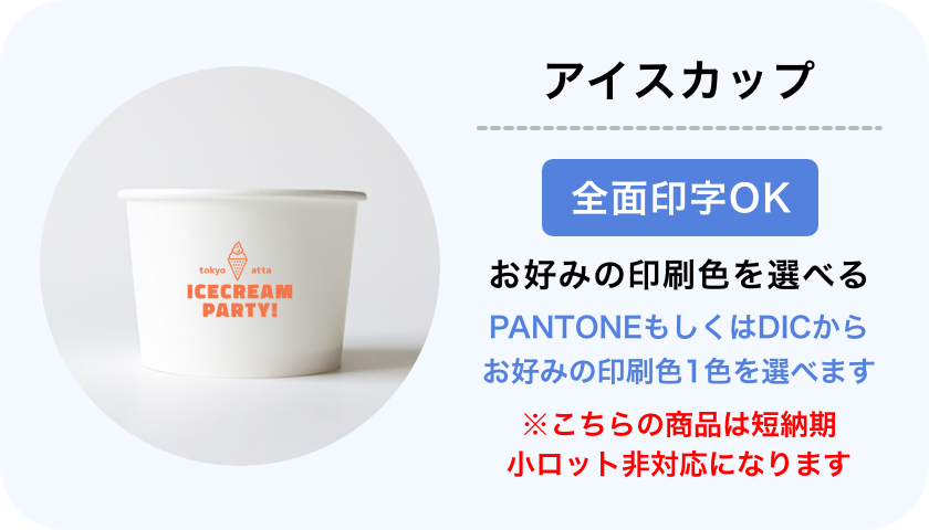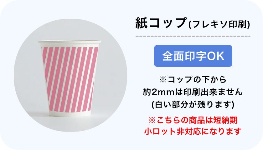 ![]() | フレキソ印刷(4色フルカラー対応)のため お客様のご希望のカラーを使用できます ※使用できるカラーは1色になります。 ※フレキソ印刷(4色フルカラー印刷対応)ですが、印刷方式の特性上、写真のような 表現には向いていません。 またコップ原紙は色の再現性が高くないため、デザインによりましては特色印刷を オススメすることがあります。 |